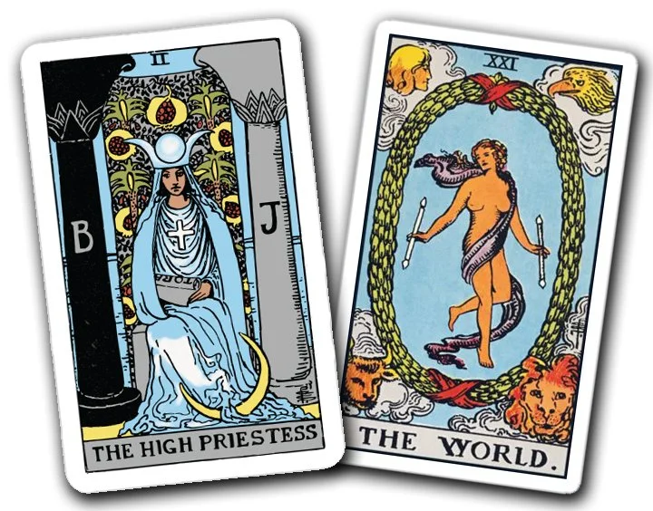 Saturn is elevated to its higher vibration by its proximity to Neptune - and Neptune is grounded to coherence in its higher vibration by its proximity to Saturn. Here, we are dealing with the High Priestess (Neptune elevated) and The World (Saturn elevated). This is the achievement of the manifestation of magic - practical magic - in the real world. This is the quantum leap. This is the higher understanding of universal love made manifest in 3D reality. It is the merger of the metaphysical with the physical, the mystical with the rational.